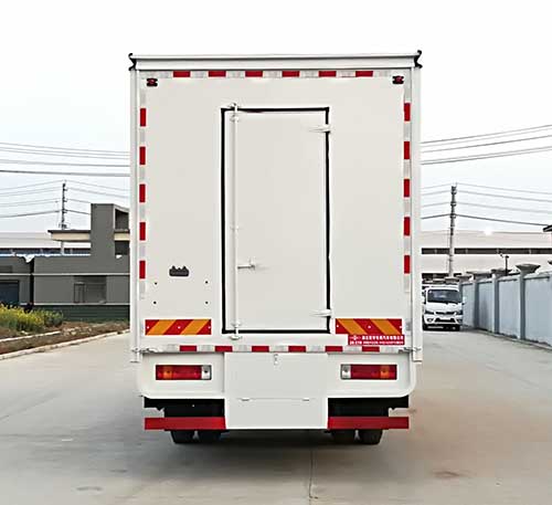选装无导流罩结构,随底盘选装驾驶室,选装车厢两侧LED屏幕结构,选装车厢两侧广告灯箱结构,选装侧门结构,选装后门样式。车厢顶棚封闭,并采用衍架结构,可升降,车厢两侧板可展开,与顶棚形成整车舞台顶棚;活动舞台板可折叠于车厢内,通过展开装置展后与固定舞台台面形成整车舞台台面;底盘大梁部分设有支撑装置。该车是进行舞台文艺表演的专用车辆。侧防护采用冷弯型钢/Q235-B,螺栓连接。后防护采用冷弯型钢/Q235-B,焊接连接,截面尺寸(宽赘?(mm):80?20,离地高450mm。ABS生产厂家/型号:上海万捷汽车控制系统有限公司/VIE ABS-II. |