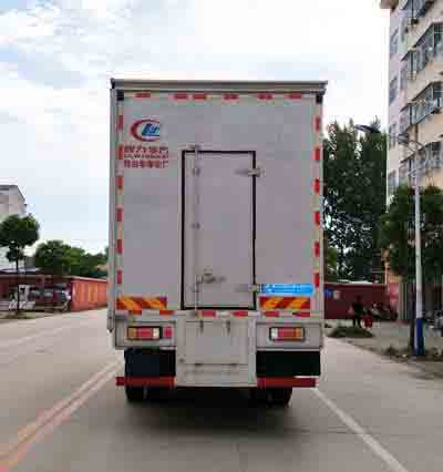 该车是进行舞台文艺表演的专用车辆。可选装LED屏,可选装不同形式后门.车厢顶棚封闭,并采用衍架结构,可升降,车厢两侧板可展开,与顶棚形成整车舞台顶棚;活动舞台板可折叠于车厢内,通过展开装置展后与固定舞台台面形成整车舞台台面;底盘大梁部分设有支撑装置。整车长/轴距/前悬/后悬/高对应关系为(mm):10000/5700/1350/2950/3950,8980/5250/1350/2380/3950,8400/4500/1350/2550/3750。侧防护采用Q235A碳钢,焊接连接,后防护采用Q235A碳钢,焊接连接,后防护截面尺寸120?0mm, 下边缘离地高度500mm。ABS型号为CM4XL-4S/4K(4S/4M),生产厂家为广州科密汽车电子控制技术股份有限公司。选装车厢两侧LED屏幕结构,选装车厢两侧广告灯箱结构,选装侧门结构,选装裙边结构,选装箱体贴画。 |