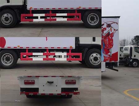 选装无导流罩结构,随底盘选装驾驶室,选装箱体贴画。车厢顶棚封闭,并采用衍架结构,可升降,车厢两侧板可展开,与顶棚形成整车舞台顶棚;活动舞台板可折叠于车厢内,通过展开装置展后与固定舞台台面形成整车舞台台面;底盘大梁部分设有支撑装置。该车是进行舞台文艺表演的专用车辆。侧防护采用冷弯型钢/Q235-B,螺栓连接。后防护采用冷弯型钢/Q235-B,焊接连接,截面尺寸(宽赘?(mm):80?20,离地高450mm。ABS系统控制方式:4S/4M,ABS系统控制器型号:CM4XL-21VI.E5,ABS系统控制器生产企业:广州科密汽车电子控制技术股份有限公司。该车作为流动演出的、可展开成为舞台。 |