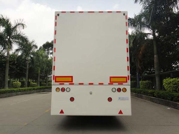舞台为关闭状态时,车厢顶部封闭.车厢前部可选装空调,车厢左侧选装侧门.侧防护和后防护均采用裙板结构,侧防护和后防护均采用裙板结构,材料为方管50?0?.0和厚3.0mm钢板,材质Q235A,连接方式为焊接固定,后防护裙板离地高度500mm.ABS型号:400 500 0810,生产企业:威伯科汽车控制系统(中国)有限公司.该车专用装置为展翼车专用液压动力单元集成系统,该主要车用于产品展示和宣传. |