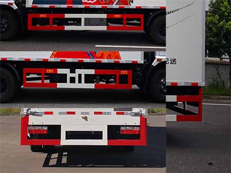 该车是进行舞台表演、展示的专用车辆;车厢两侧可选装宣传设备(灯箱、LED屏等),选装宣传设备时整备质量9105kg,额定载质量100kg;选装导流罩,选装高度不同的厢体;随底盘选装前面罩,前保险杠,前组合灯具;防护材质为Q235,侧防护装置连接方式为螺栓连接,后下部防护装置连接方式为焊接,后下部防护装置截面尺寸及离地高度分别为100mm*100mm和475mm;ABS厂家及型号:襄阳东风隆诚机械有限责任公司/ABS/ASR-24V-4S/4M。 |