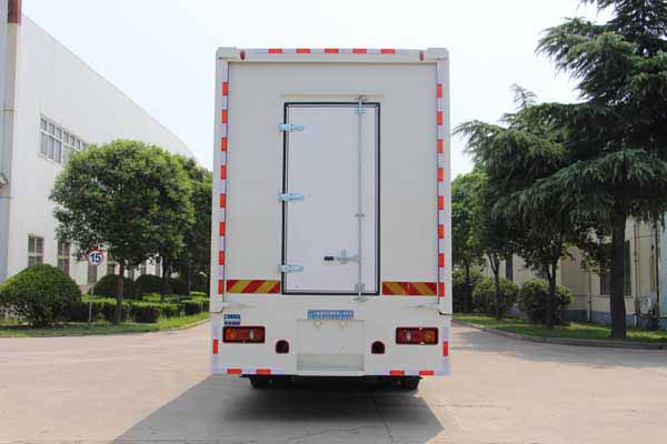 该车舞台厢体可选用两种开启结构:一种为两侧开启(车辆作业时侧板展开连同顶板可升起形成舞台顶棚,厢内辅助台板可展开平铺形成舞台地板,厢体底部设置支撑装置);另一种为单侧开启(作业时其单侧板可向上展开形成舞台顶棚,厢内辅助台板可展开平铺形成舞台地板,厢体底部设置支撑装置)。主要专用设备:舞台板、顶棚、舞台开合操作系统、支撑装置、音响等宣传设备。车辆行驶时厢体处于闭合状态。该车随底盘选装驾驶室,该车驾驶室可选装无导流罩。厢体前板上部可选装挡雪板,厢体前部可选装不带爬梯,厢体后门可选装左侧开启、可带锁杆型式或隐藏式锁具型式。侧部防护和后部防护装置均为裙板式结构,防护装置均采用Q235A普通碳素钢板(厚度1.5mm)折弯组合焊接而成,防护装置均采用焊接方式与车体连接,后防护装置宽度为2490mm,后防护装置离地高度为480mm。ABS生产厂家/型号:东科克诺尔商用车制动系统(十堰)有限公司/3631010-C2000。该车是进行文艺演出活动用的专用作业车辆。 |