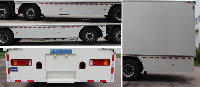 车辆作业时侧板展开连同顶板可升起形成舞台顶棚,厢内辅助台板可展开平铺形成舞台地板,厢体底部设置支撑装置。主要专用设备:舞台板、顶棚、舞台开合操作系统、支撑装置、演出宣传设备(LED屏、音响等设备)。车辆行驶时厢体处于闭合状态。驾驶室准乘人数和额定载质量的对应关系:3人/7000kg、2人/7065kg。随底盘可选装驾驶室。侧部防护和后部防护装置均为裙板式结构,防护装置均采用Q235A普通碳素钢板(厚度1.5mm)折弯组合焊接而成,防护装置均采用焊接方式与车体连接,后防护装置宽度为2530mm,后防护装置离地高度为490mm。ABS生产厂家/型号:威伯科汽车控制系统(中国)有限公司/4460046440。该车是进行文艺演出活动用的专用作业车辆。 |