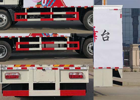 备注:整车长/轴距/后悬对应关系(mm):8600/4560/2810,8150/4200/2720;选装驾驶室无导流罩结构,选装车厢两侧或一侧LED屏幕结构,选装车厢两侧无贴画结构,选装后门结构;车厢顶棚封闭,并采用衍架结构,可升降,车厢两侧板可展开,与顶棚形成整车舞台顶棚,活动舞台板可折叠于车厢内,通过展开装置展后与固定舞台台面形成整车舞台台面;底盘大梁部分设有支撑装置;侧防护材料Q235,螺栓连接,后防护材料Q235,焊接连接,后防护截面高度尺寸140mm,截面宽度尺寸50mm,下边缘离地高度440mm;ABS系统控制方式:4S/4M,ABS系统控制器型号:CM4XL-21VI.E5,ABS系统控制器生产企业:广州科密汽车电子控制技术股份有限公司;该车主要装置为厢体,厢体可展开用于舞台文艺表演. |