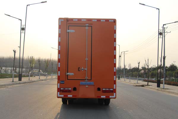 舞台厢体可选装三种结构:第一种为侧板整体垂直举升内藏式舞台板铺平形成舞台;第二种为侧板上翻开启内藏式舞台板铺平形成舞台;[前两种结构厢体侧部可选装卷轴画面装置或LED屏,LED屏外部可选装盖板];第三种为侧部和后部均开启形成舞台(舞台台口在车辆后部)。后部可选装不同的型式(左侧开门、中间开门、无后门、后部对开门型式)。主要专用设备:舞台板、舞台开合操作系统、支撑装置等。厢体侧部防护和后部防护装置均为裙板式结构,防护装置均采用Q235A普通碳素钢板(厚度1.5mm)折弯组合焊接而成,防护装置均采用焊接方式与车体连接,后防护装置离地高度为420mm。ABS控制器厂家/型号:ABS 8/克诺尔制动设备(上海)有限公司。该车是进行文艺演出或产品宣传展示用的专用作业车辆。 |