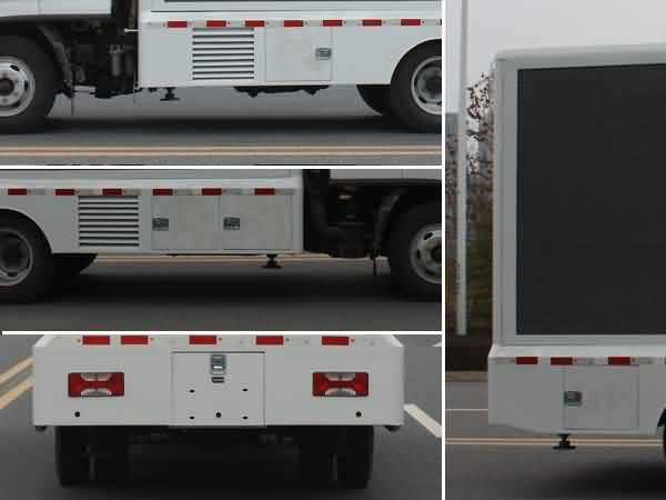 随底盘选装驾驶室,导流罩为选装件;选装左右两侧玻璃滚轴,LED屏(屏幕选装液压升降,活动舞台),选装后部工具箱位置.ABS系统控制器型号为VIE ABS-II,ABS系统控制器生产企业为浙江万安科技股份有限公司;侧面防护装置及后下部防护装置采用Q235材质,整体式结构,后下部防护装置离地高度:480mm. |
