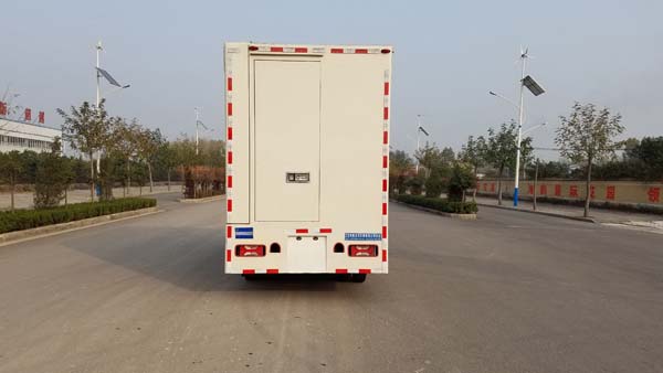 1、厢体右侧选装LED屏,LED屏可选装盖板形式,右侧可选装封闭式结构(详见选装照片1);2、后部选装LED显示屏、后部选装封闭式形式、开后门形式;(详见选装照片2);3、驾驶室可选装导流罩,厢体可选装单侧开启形成展台进行宣传活动(此结构侧部和后部可不选装LED屏或广告卷轴装置,详见选装照片3)。ABS系统控制器型号为VIE ABS-II,ABS系统控制器生产企业为浙江万安科技股份有限公司,厢体侧部防护和后部防护装置均为裙板式结构,防护装置均采用Q235A普通碳素钢板(厚度1.5mm)折弯组合焊接而成,防护装置均采用焊接方式与车体连接,后防护装置离地高度为420mm。该车是进行宣传展示用的专用车辆。 |