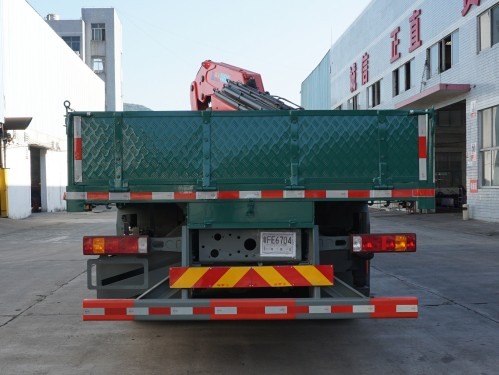 起重机型号SQ720,最大起升载荷为11200Kg,质量为7100Kg;选装SQ500,最大起升载荷为11000Kg,质量为6100Kg;左、右及后下部防护装置所用材料为Q235-A;左右防护装置与底盘是采用螺栓连接,后防护采用螺栓连接;后防护装置断截面尺寸为80mm?40mm,离地高度为470mm;该车安装具有卫星定位功能的行驶记录仪;ABS系统型号为4460046300,生产企业为威伯科汽车控制系统(中国)有限公司;发动机MC07.28-50,MC07.31-50,MC07.34-50,MC07.35-50,MC07.28-52,MC07.31-52,MC07.34-52的油耗申报值(L/100km)分别为39.1,39.2,39.4,39.5,39.1,39.2,39.4.随底盘选装驾驶室,选装随车起重机吊臂外观及支腿安装方式,选装不同货厢边板材料及结构,该车型可选装ETC车载装置. |