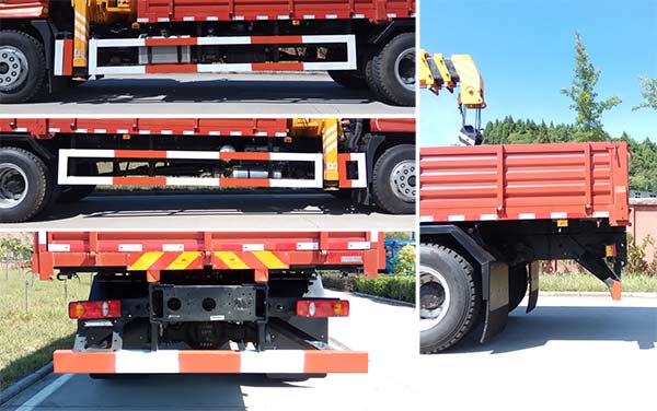 | 随底盘选装前组合灯、前面板、遮阳罩及前保险杠等新风格。选装上下坡道装置。选装工作座椅安装位置和后部工作支腿,选装货厢结构。尺寸对应关系为:8400=1450+4500+2450;8700=1450+4700+2550;9000=1450+5000+2550;9000=1450+5300+2250;9000=1450+5600+1950。发动机及其对应油耗值为:YC4EG160-50/29.5,YC6JA180-50/29.0,YNF40E1/29.0,YC4E160-56/29.0,YC6JA220-50/30.5。吊机型号/吊机质量(kg)/最大起升载荷(kg)对应关系分别为:SQ8S/3600/7350。侧、后防护装置材料均为Q235,侧防护螺栓连接;后防护焊接连接,后防护离地高度为480mm,截面高度和厚度为160mm?0mm。该车安装具有卫星定位功能的行驶记录仪。ABS型号:VIE ABS-II,生产厂家:浙江万安科技股份有限公司;ABS型号为:3550X-1010,生产厂家:东科克诺尔商用车制动系统(十堰)有限公司;ABS型号:CM4XL-4S/4M,生产厂家:广州瑞立科密汽车电子股份有限公司。 |