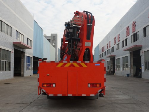 起重机型号SQ500,最大起升载荷为11000Kg,质量为6100Kg;选装SQ720,最大起升载荷为11200Kg,质量为7100Kg;左、右及后下部防护装置所用材料为Q235-A;左右防护装置与底盘是采用螺栓连接,后防护采用专用装置代替,离地高度为460mm;该车安装具有卫星定位功能的行驶记录仪;ABS系统型号为4460046300,生产企业为威伯科汽车控制系统(中国)有限公司;发动机MC07.28-50,MC07.31-50,MC07.34-50,MC07.35-50,MC07.28-52,MC07.31-52,MC07.34-52的油耗申报值(L/100km)分别为339.1,39.2,39.4,39.5,39.1,39.2,39.4;随底盘选装驾驶室;选装货箱形式和随车起重机吊臂外观。 |