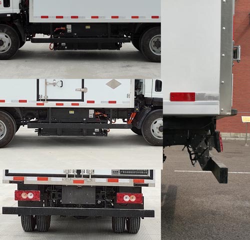 1,该车随底盘选装前部不带前雾灯,选装带导流罩样式,车厢顶部封闭不可开启;选装右侧不开门货厢,双开门货箱,后部货箱开门样式.2,ABS型号/生产厂家:RL-1/瑞立集团瑞安汽车零部件有限公司.3,电池种类/生产企业/:磷酸铁锂蓄电池/宁德时代新能源科技股份有限公司.型号:L173TB1/L173TB2.4,驱动电机类型:永磁同步电机;型号:TZ370XSH35;额定功率70kW;峰值功率140kW;生产企业:苏州蓝盛电子有限公司.电机控制器型号:KTZ35X40SH35;生产企业:苏州蓝盛电子有限公司.该车型可选装ETC车载装置,侧面防护装置材料为铝合金6061-T6,连接方式为螺栓连接,后下部防护装置材料为铝合金6005,连接方式为螺栓连接.后部防护装置断面尺寸(长卓?:100mm?0mm,离地高度为480mm. |