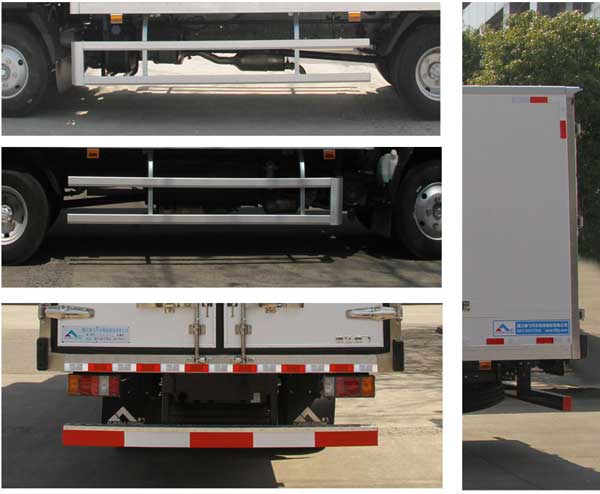 | 车厢顶部封闭,不可开启.可选装其它功率相同制冷机组,可选装底置制冷机组;选装侧门或不装侧门,车厢右侧和左侧均可选装侧门、选装单侧门、双侧门的侧门数量;选装普通侧门、对开侧门、联开侧门、侧拉门等侧门形式、侧门和后门选装明门杠或暗门杠的门锁形式; 所有选装引起的质量参数变化在3%以内.侧防护材料铝合金或Q235,后下部防护材料Q235, 侧防护和后防护与车辆均采用螺栓连接;后下部防护下边缘离地高度450mm,断面(高120mmX宽75mm);当选用液压尾板时,液压尾板收起状态的水平长度为280mm,尾板质量350kg,后下部防护与尾板悬臂螺栓连接,后下部防护材料Q235, 后下部防护下边缘离地高度450mm,后防护截面为圆形,截面直径为120mm. 发动机净功率为94kW; ABS及其控制器型号为:APG3550500A4,生产厂家为:浙江亚太机电股份有限公司.选装ETC. |