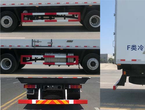 | 厢体顶部封闭,不可开启。随底盘选装保险杠、翼子板,选装后视镜,选装车门下饰板,选装卧铺侧窗,选装绿玻璃,选装平顶驾驶室,选装导流罩。选装液压尾板,液压尾板收起时离车辆最后端距离280mm。选装侧面箱门型式。选装后门样式。选装制冷量相同的制冷机组。侧防护采用冷弯型钢/Q235-B,螺栓连接;后防护采用冷弯型钢/Q235-B,焊接连接。后防护截面高度尺寸120mm, 截面宽度尺寸50mm,下边缘离地高度500mm。选装限速装置,限速80km/h.ABS型号/企业:ABS-E 4S/4M/威伯科汽车控制系统(中国)有限公司,CM4XL-4S/4M/广州瑞立科密汽车电子股份有限公司。安装具有卫星定位功能的行驶记录仪。发动机型号/油耗申报值对应关系为:YCS06245-60A/30.3L/100km,YCS06270-60/30.3L/100km.车长/轴距/后悬对应关系为:12000/2050+5350/3155,11095/2050+4450/3150,10200/2050+4050/2655.液压尾板质量550千克。 |