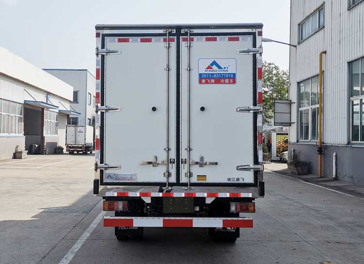 车厢顶部封闭,不可开启.可选装其它功率相同制冷机组,可选装底置制冷机组;选装侧门或不装侧门,车厢右侧和左侧均可选装侧门、选装单侧门、双侧门的侧门数量;选装普通侧门、对开侧门、联开侧门、侧拉门等侧门形式、侧门和后门选装明门杠或暗门杠的门锁形式; 随底盘选装宽轮眉,窄轮眉,驾驶室前部标牌;随底盘选装不同样式的前围;选装一组前、后示廓灯;厢内高1800mm对应整车高2960;所有选装引起的质量参数变化在3%以内.侧防护材料铝合金或Q235,后下部防护材料Q235, 侧防护和后防护与车辆均采用螺栓连接;后下部防护下边缘离地高度470mm,断面(高120mmX宽75mm).选装液压尾板时,液压尾板收起状态的水平长度为280mm尾板质量350kg,后下部防护与尾板悬臂螺栓连接,后下部防护下边缘离地高度430mm,后防护截面为圆形,截面直径为120mm.发动机4KH1CN6LB净功率为87kW,油耗值为11.3L/100km; 发动机4KH1CN6HB净功率为96kW,油耗值为11.4L/100km; 前悬/后悬:1110/1525 (mm)对应轴距3360mm, 前悬/后悬:1120/1510(mm)对应轴距3365mm;随底盘选装制动系统:装液压制动系统时,ABS及其控制器型号/生产企业对应关系为:APG3550500A/浙江亚太机电股份有限公司,CM4YL/广州瑞立科密汽车电子股份有限公司;装气压制动系统时,ABS及其控制器型号/生产企业对应关系为:CM4XL-4S/4M/广州瑞立科密汽车电子股份有限公司.选装ETC. |