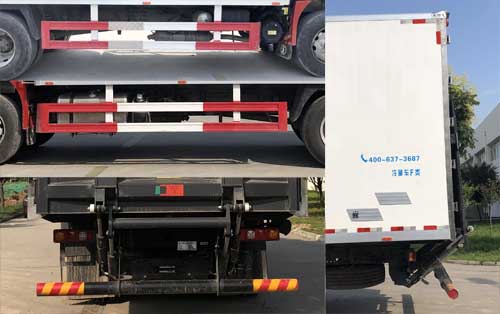 1,该车在5000,5300,5700的轴距上改装;整车长度/前悬/轴距/后悬/货箱对应关系为9200/1340/5000/2860/6900,9200/1340/5300/2560/6900,10200/1340/5700/3160/7900;2.随底盘选装导流罩,选装货箱,货箱侧面选装单开门、双开门、联动门、对开门、侧拉门和不开门等不同形式侧门.后门和侧门可选装盒式暗锁或明挂锁,后门可选装四杠四锁结构,顶部封闭,不可开启;选装液压尾板(液压尾板质量为550kg,液压尾板收起时的水平长度为300mm).3,侧后防护所用材料均为:Q235;连接方式:螺栓连接;后防护断面宽度(mm):Φ120;后防护离地高度(mm):430.4,ABS装置生产厂家及型号:西安正昌电子股份有限公司(型号:ZQFB-V).5,该车装有带卫星定位功能的行驶记录仪.6.装YCK05190-60,YCK05210-60,YCK05240-60发动机时油耗申报值为26.8L/100km. |