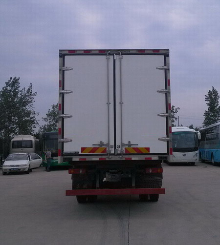 厢体顶部封闭,不可开启;可选装无侧门厢体,可选装其它厂家功率相当的制冷机组,选装尾板,尾板质量为550kg,尾板收起状态时的水平长度为295mm;选装尾板时仅选用断面尺寸Φ121mm的后防护,后防护材质:Q235,连接方式:焊接,离地高度470mm;前雾灯,前面罩,前围扰流板均为选装件;选装卧铺侧窗装饰板,驾驶室顶部装饰灯为选装件,选装不同材质油箱,选装储气筒位置.侧防护:材质Q235,螺栓连接;后下防护:材质Q235,螺栓连接,断面尺寸(mm)120?0,离地高度460mm;安装具有卫星定位功能的行驶记录仪.装有ABS,ABS型号:3631010-C2000,4460046440,生产厂家:东科克诺尔商用车制动系统(十堰)有限公司,威伯科汽车控制系统(中国)有限公司.车辆的长度/轴距/后悬(mm)的对应关系为: 8600/4700/2470, 9000/5000/2570.随底盘选装限速装置,限速89km/h. |