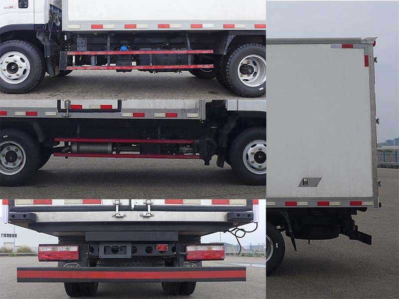 侧、后防护栏材质:Q235,与车辆用螺栓连接,后部防护装置的断面尺寸为:130?0,离地高度为460mm;车厢顶部封闭,不可开启;ISF2.8s5148T油耗12.5,ISF3.8s5154油耗12.6;ABS型号/厂家:ABS/ASR-24V-4S/4M,东科克诺尔商用车制动系统(十堰)有限公司;CM4XL-4S/4M,广州瑞立科密汽车电子股份有限公司;选装功率相当的其它型号制冷机组;选装前面罩 |