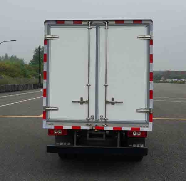 车厢顶部封闭,不可开启.随底盘选装平顶、货箱外观、不带侧开门货箱、选装导流罩;选装功率相当的其它型号制冷机组;4DW93-78E5 发动机净功率为57kW,油耗值为11.3(L/100km),D19TCIE1发动机净功率为70kW,油耗值为11.4(L/100km);防护装置材料Q235A,螺栓连接, 后部防护装置断面尺寸100?0mm,离地高度420mm.该车安装ABS型号为CM4XL-4S/4K(4S/4M),生产厂家为广州科密汽车电子控制技术股份有限公司. |