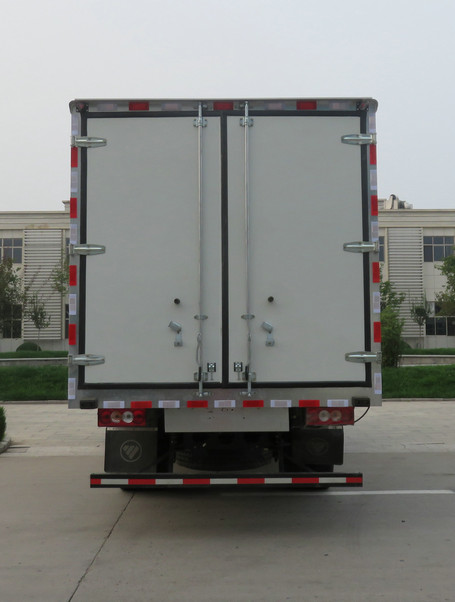厢体顶部封闭,不可开启,可选装导流罩,可选装新保险杠,可选装双侧开门,可选装取消侧开门,可选装液压尾板,不同尾板收起状态下对应水平长度为295mm,400mm,选装液压尾板时,整备质量为5490,载质量为4305;侧防护材料为冷板B-2.0,后防护材料为矩形管20-D-100?0?,均为螺栓连接.后部防护装置截面尺寸100mm?0mm,离地高度470mm,ABS系统型号:ABS-E;生产企业:威伯科汽车控制系统(中国)有限公司;ABS系统型号:ABS-VI.E;生产企业:广州瑞立科密汽车电子股份有限公司;可选装同等功率制冷机组, |