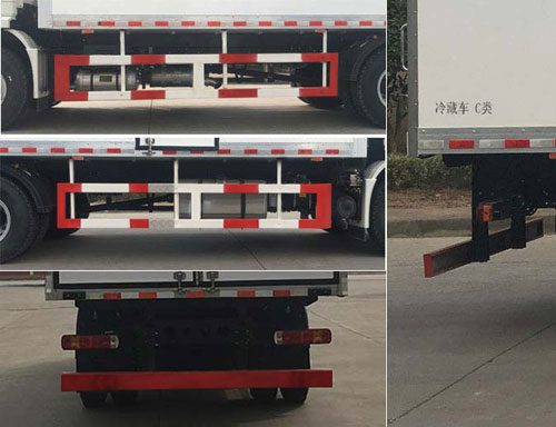 车厢顶部封闭,不可开启; 选装不同样式货箱风格;随底盘选装顶部导流罩,选装遮阳罩,选装进气管道,选装铁质油箱,选装功率相当的其它型号的制冷机组。防护装置材料为Q235,侧防护与车辆连接方式为螺栓连接,后防护与车辆连接方式为焊接连接,后防护断面尺寸:50mm(厚度)?20mm(高),离地高度为480mm.仅选用WP6.180E50、WP4.1Q160E50发动机,发动机的油耗申报值(L/100km)为:WP6.180E50/26.9,WP4.1Q160E50/26.9;该车安装具有卫星定位功能的行驶记录仪,ABS型号/生产企业对应关系为:ABS-E 4S/4M/威伯科汽车控制系统(中国)有限公司;VIE ABS-Ⅱ/浙江万安科技股份有限公司;CM4XL-4S/4M/广州瑞立科密汽车电子股份有限公司。 |
