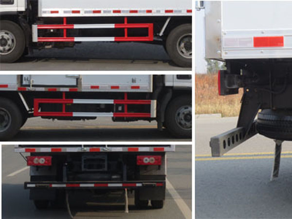 厢体顶部封闭,不可开启;随底盘选装驾驶室;厢体选装瓦楞板结构,厢体侧面选装开门型式及位置或不带侧开门,选装百叶窗;运输介质类项号为9;该车为危险品货物运输车;仅采用前轮盘式制动器,前置排气管,子午线轮胎,限速装置的底盘,限速80km/h;转向轮安装爆胎应急防护装置;发动机/油耗申报值(L/100km)对应关系为:F3.8NS6B156/16.20,CY4SK261/16.09,D30TCIF1/16.19;该车安装具有卫星定位功能的行驶记录仪;ABS系统型号:ABS-VI.E;生产企业:广州瑞立科密汽车电子股份有限公司.ABS系统型号:ABS-E;生产企业:威伯科汽车控制系统(中国)有限公司;侧面防护及后下部防护装置材料材质:Q235,连接方式:焊接加螺栓连接;后下部防护装置断面尺寸(宽赘?:50?00(mm),离地高度:460mm. |
