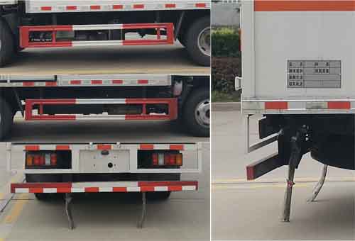 随底盘选装驾驶室;该车为危险品运输车;厢体顶部密封,不可开启,厢体两侧选装不同形式侧开门及开门位置或不带侧门,选装开百叶窗,选装瓦楞板结构.用于运输具有独立容器(瓶)包装的氨溶液(水溶液在15℃时的相对密度为0.880至0.975,含氨量不低于10%,但不超过35%),固态氢氧化钠,氢氧化钠溶液,硫酸(含酸高于51%),硫酸废液,碱石灰(含氢氧化钠高于4%),甲醛溶液(甲醛含量不低于25%),酸性电池液,碱性电池液,固态氢氧化铬,氢氧化铬溶液,类项号:8类。侧/后防护材料为Q235,连接方式:焊接连接,后防护截面尺寸(mm):100?0,离地高度450mm。该车仅使用排气管前置、前轮为盘式制动器、装配子午线轮胎的底盘,转向轮安装轮胎爆胎应急防护装置,安装导静电带;该车装有ABS,ABS系统型号:APG3550500A,ABS系统生产厂家:浙江亚太机电股份有限公司;该车安装具有卫星定位功能的行驶记录仪,该车装配有限速装置,限速80km/h。发动机型号对应油耗申报值:JX4D30B6H/10.82L/100km,JX4D30A6H/11.4L/100km。 |