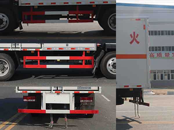 1、厢体顶部封闭,不可开启;2、选装侧门型式及位置,选装百叶窗,选装前部LOGO;3、选装侧门对应外形尺寸宽度2530mm,不带侧门对应宽度2500mm;4、排气管前置.只装用子午线轮胎,前轮盘式制动器.ABS型号为CM4XL-4S/4M,生产厂家为广州瑞立科密汽车电子股份有限公司,该车安装带有卫星定位功能的行驶记录仪;5、该车为危险货物运输车,该车专门用于运输具有独立容器(瓶)包装的:含废矿物油与含矿物油废物, 染料、涂料废物, 含铬废物, 含铜废物, 含镉废物, 含铅废物, 含镍废物, 有色金属冶炼废物, 废弃电池,2008年国家环境保护部,国家发展和改革委员会令第1号发布的《国家危险废物名录》危险货物编号:(HW08,HW12,HW21,HW22,HW26,HW31,HW46,HW48,HW49),危险货物类项9;6、防护装置材料:侧面防护及后下部防护装置材料材质:冷弯型钢/Q235,连接方式:焊接,后下部防护装置截面尺寸100mm?0mm,离地高度480mm;7、WP4.1NQ190E61发动机油耗值为19.65L/100km;8、装限速装置,限速80km/h,已安装爆胎应急防护装置. |