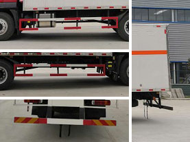 该车适用于运输危险品为危险品运输车。厢体顶部封闭,不可开启。选装侧门形式及位置。仅采用底盘子午线轮胎和带ABS的底盘,该车前轮安装盘式制动器,前置排气管,装配限速装置,限速80km/h。安装带有卫星定位功能的行驶记录仪。安全装置为导静电带,用于防止静电。整车长度/轴距/后悬对应关系为(mm):8900/5250/2360,8900/4800/2810,8500/4500/2710,8500/4800/2410。该车主要用于运输具有独立(瓶)包装的含铜废物,含镍废物,含铅废物,含铬废物,废矿物油,废弃电池等危险废物,类项号:9。危险废物编号: HW21,HW22, HW26,HW31,HW46,HW49,侧防护和后防护装置材料材质为Q235A碳钢,侧防护与箱体副梁焊接连接,后防护装置与车架采用焊接连接。后防护截面尺寸(mm):120?0,离地高度为500mm。发动机WP4.6NQ220E61对应的油耗值(L/100km)为:25.89。ABS型号为CM4XL-4S/4M,生产厂家为广州瑞立科密汽车电子股份有限公司。 该车转向轮装备轮胎爆胎应急防护装置,后轴为采用空气悬架. |
