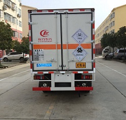 该车适用于运输危险品。厢体顶部封闭,不可开启。选装右侧箱体开门形式。选装不带侧开门对应的宽度为1950mm。仅采用底盘子午线轮胎和带ABS的底盘,该车前轮安装盘式制动器,前置排气管,装配限速装置,限速80km/h。安装带有卫星定位功能的行驶记录仪。安全装置为导静电带,用于防止静电。运输具有独立容器(瓶)包装的介质:砷,苯酚,二甲基苯胺,五氧化二钒,苯胺,邻甲苯胺,丙烯醛,甲基氯(醚),氯化钡(铜,钾,钠),农药等,运输介质类别和项别号:6.1,6.2.侧防护和后防护装置材料材质为Q235A碳钢,侧防护与箱体底部焊接连接,后防护装置与车架采用焊接连接。后防护截面尺寸(mm):110?0,离地高度为500mm。发动机JX493ZLQ5,JX493ZLQ5A对应的油耗值分别为:11.9,10.8。ABS系统型号:APG3550500A,ABS系统生产厂家:浙江亚太机电股份有限公司。随底盘选装驾驶室。转向轮装备轮胎爆胎应急防护装置。 |