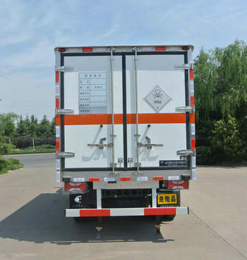 该车为危险品货物运输车;厢体顶部封闭,不可开启;厢体选装单侧门;选装液压尾板,尾板收起状态的水平长度295mm;车身侧面及后部粘贴橙色反光标识和标志牌,在车体后部设置安全标示;运输具有独立容器(瓶)包装的砷,苯酚,二甲基苯胺,苯胺,邻甲苯胺,丙烯醛,烯丙醇,甲基氯(醚),氧化汞,农药;感染性物质,类项号:6.1,6.1,6.1,6.1,6.1,6.1,6.1,6.1,6.1,6.1;6.2;该车安装具有卫星定位功能的行驶记录仪;防护装置材料为Q235,与车辆连接方式为螺栓连接;后防护断面宽100?0mm,离地高420mm;ABS系统型号:APG3550500A6、VIE ABS-II,ABS系统控制器生产企业为浙江亚太机电股份有限公司、浙江万安科技股份有限公司;仅用子午线轮胎,仅用底盘限速装置及前盘制动;仅选用底盘的前置排气管结构;随底盘选装前围和相关附件;对应油耗:SC28R125Q5A(12.76),SOFIM8140.43DV(12.7);尾板收起状态的水平长度为295mm;随底盘选装前部、侧面标识及格栅造型 |
