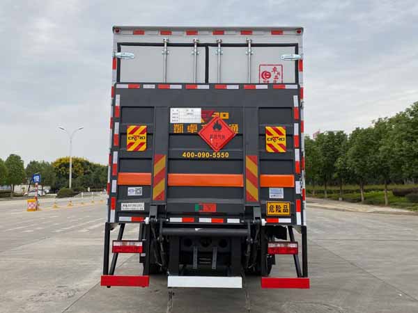 ABS型号:J ABS;ABS生产企业:焦作博瑞克控制技术有限公司;安装有限速装置;限速装置限速(km/h):80;安装有具有卫星定位功能的行驶记录仪;选装描述:选装后部无尾板,随底盘选装同系列的高顶驾驶室,选装气喇叭,遮阳罩,绿色滤光带,踏步.该车型可选装ETC车载装置.运输具有独立包装的不可燃气体,安装2.2类危险品标识.选装侧门型式及位置,选装侧门数量,选装不开侧门,厢体侧面板选装开百叶窗,选装瓦楞板结构;发动机/油耗值(L/100km)对应关系为:B6.2NS6B230/26.7,D4.5NS6B220/26.6,YCS04200-68/26.4,CY4SK761/26.8;侧后防护情况:侧,后防护材料均为Q235,侧防护螺栓连接;后防护焊接,截面尺寸120?20mm,下边缘离地高480mm;尾板、上下坡道(或类似装置)收起状态的水平长度(mm):液压升降尾板收起状态水平长度为290mm,尾板质量为550kg;车厢顶部封闭且不可开启;运输独立容器(瓶)包装的货物;FL型车辆;危险货物类项号:2.1,2.2;其他说明:该车为危险货物运输车.仅选用排气管前置,限速装置,前轮盘式制动及子午线轮胎的底盘.后轴采用空气悬架.转向轮安装轮胎爆胎应急防护装置; |