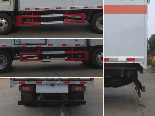 ABS型号:ABS-VI.E,ABS-E,YF8;ABS生产企业:广州瑞立科密汽车电子股份有限公司,威伯科汽车控制系统(中国)有限公司,武汉元丰汽车电控系统有限公司;安装有限速装置;限速装置限速(km/h):80;安装有具有卫星定位功能的行驶记录仪;选装描述:随底盘选装驾驶室;厢体侧面选装开门型式及位置,选装不带侧开门,选装瓦楞板结构;该车选装ETC车载装置;发动机/油耗值(L/100km)对应关系为:Q23-115C60/11.4,Q23-115E60/11.4;所用材料材质、连接方式以及后部防护装置的主要尺寸参数(断面尺寸和离地高度):侧面防护及后下部防护装置材料材质:Q235,连接方式:焊接加螺栓连接;后下部防护装置断面尺寸(宽赘?:40?00(mm),离地高度:340mm;车厢顶部封闭且不可开启;运输独立容器(瓶)包装的货物;危险货物类项号:3;其他说明:该车为危险品货物运输车;仅采用前轮盘式制动器,前置排气管,子午线轮胎;转向轮安装爆胎应急防护装置; |