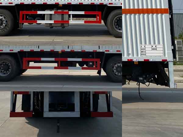 1、该车适用于运输危险品。厢体顶部封闭,不可开启。运送危险品类项号:3。液压升降尾板收起状态水平长度为290mm,尾板质量为550kg。2、侧,后防护材料均为Q235,螺栓连接;后防护截面尺寸120?0mm,下边缘离地高490mm。选装后部无液压尾板。3、随底盘选装平顶驾驶室;选装驾驶室前面罩;高顶驾驶室顶部气喇叭为选装件;驾驶室前角扰流板为选装件。选装驾驶室顶部“东风商用车”企业标识。仅选用排气管前置、限速装置(限速80km/h)、前轮盘式制动及子午线轮胎的底盘;安装带卫星定位功能的行驶记录仪。ABS型号/生产厂家:ABS 8/东科克诺尔商用车制动系统(十堰)有限公司。发动机/油耗值(L/100km)对应关系为:DDi75E350-60/38.1。后轴采用空气悬架,转向轮装备轮胎爆胎应急防护装置。该车型可选装ETC车载装置. |
