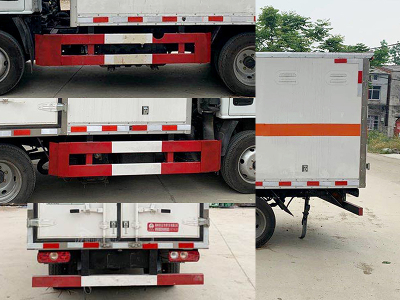 1.该车用于危险品运输,厢体顶部封闭,不可开启,运输独立容器包装的介质,类项号:3;2.侧/后防护材料为Q235,侧防护螺栓连接,后防护焊接连接,截面尺寸100?0mm,下边缘离地高450mm;3.选装驶室前围面板,前围格栅,后视镜,前部灯具,前保险杠外观,选装轮辋外观;选装侧开门,侧门单开门、侧门双开门、侧门不开门,选装侧门型式及位置,百叶窗,选装瓦楞板;整车长度/轴距/后悬对应关系(mm):5440/2850/1500, 5160(5050)/2650/1420(1310);仅选用排气管前置,只装用子午线轮胎,前轮盘式制动器,安装限速装置最高车速80km/h,安装具有卫星定位功能的行驶记录仪,转向轮安装轮胎爆胎应急防护装置,该车型可选装车载ETC装置;ABS控制器型号/生产厂家:YF8/武汉元丰汽车电控系统有限公司;Q23-95E60对应油耗值为11.4L/100km;仅选用2850mm,2650mm轴距改装. |