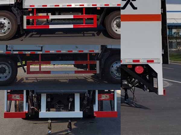 1、该车适用于运输危险品。厢体顶部封闭,不可开启。类项号:2.1,2.2。2、侧、后防护材料均为Q235,侧防护螺栓连接;后防护焊接,后防护截面尺寸100?0mm,下边缘离地高450mm。3、仅采用3800mm的轴距。随底盘选装前围及灯具.安装带有卫星定位功能的行驶记录。转向轮安装轮胎防爆应急防护装置。仅选用排气管前置、限速装置(限速80km/h)、前轮盘式制动及子午线轮胎的底盘.ABS系统控制器型号/生产企业:ABS-E/威伯科汽车控制系统(中国)有限公司,ABS-VI稥/广州瑞立科密汽车电子股份有限公司.发动机/油耗值(L/100Km)对应关系为:F3.8NS6B156/20.81。该车型可选装ETC车载装置。液压升降尾板收起状态水平长度为290mm,尾板质量为420kg。 |