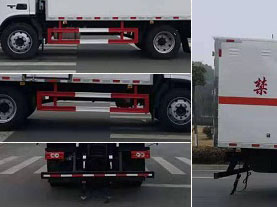 该车适用于运输危险品。厢体顶部封闭,不可开启。选装右侧箱体不开门,选装侧门型式及位置。仅采用底盘子午线轮胎和带ABS的底盘,该车前轮安装盘式制动器,前置排气管,装配限速装置,限速80km/h。安装带有卫星定位功能的行驶记录仪。安全装置为导静电带,用于防止静电。侧防护和后防护装置材料材质为Q235A碳钢,侧防护与箱体副梁焊接连接,后防护装置与车架采用焊接连接。后防护截面尺寸(mm):120?0,离地高度为500mm。整车长度/轴距/后悬对应关系为(mm):7030/3800/2100,6650/3360/2160。该车主要用于运输独立容器包装的易燃气体:液化石油气,原油气,压缩天然气,乙炔,甲烷,乙烷,丙烷,丁烷,丙烯,丁烯,二甲醚,硫化氢,打火机或打火机加油器(装有易燃气体),压缩氢,类项号:2.1;运输具有独立容器包装的非易燃无毒气体:液化气体(非易燃,充有氮,二氧化碳或空气),压缩氧(氮,空气,氦,氩,氖),二氧化碳,类项号2.2。仅采用发动机F3.8NS6B156对应的油耗值(L/100km)为:20.81。ABS系统控制器型号/生产企业:ABS-E/威伯科汽车控制系统(中国)有限公司,ABS-VI稥/广州瑞立科密汽车电子股份有限公司。转向轮装备轮胎爆胎应急防护装置。随底盘选装驾驶室。 |