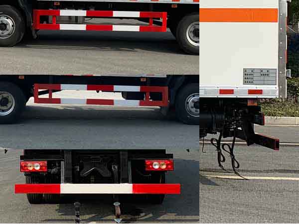 1、该车用于危险品运输,厢体顶部封闭,不可开启.该车运输具有独立容器包装的气体介质,运输介质类项号为2.1,2.2.运输易燃气体时挂2.1类警示牌,运输非易燃无毒气体时挂2.2类警示牌。2、侧/后防护材料为Q235,侧防护螺栓连接,后防护焊接连接,截面尺寸120?0mm,下边缘离地高450mm。3、仅选用排气管前置,只装用子午线轮胎,前轮盘式制动器,安装限速装置最高车速80km/h,安装具有卫星定位功能的行驶记录仪;ABS系统控制器型号/生产企业:ABS-E/威伯科汽车控制系统(中国)有限公司。发动机/油耗值(L/100km):F3.8NS6B156/15.4。转向轮安装轮胎爆胎应急防护装置.随底盘选装排半驾驶室。选装平板单开门和双开门,选装瓦楞板单开门和双开门,可选装ETC车载装置。 |