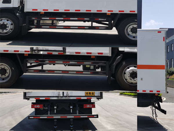 1、该车适用于运输危险品。厢体顶部封闭,不可开启。该车运输具有独立容器包装的易燃气体,运送危险品类项号为2.1;运输具有独立容器包装的非易燃无毒气体,运送危险品类项号为2.2。选装无侧门,或单个多个对开侧门、单个单开侧门及侧门样式。2、侧、后防护材料均为Q235,侧防护焊接连接,后防护焊接,截面尺寸100?0mm,下边缘离地高450mm。3、安装带有卫星定位功能的行驶记录。仅选用排气管前置、限速装置(限速80km/h)、前轮盘式制动及子午线轮胎的底盘;ABS系统型号:ABS-VI.E;生产企业:广州瑞立科密汽车电子股份有限公司.ABS系统型号:ABS-E;生产企业:威伯科汽车控制系统(中国)有限公司。发动机F3.8NS6B156的油耗值为:21.02L/100Km。转向轮安装轮胎爆胎应急防护装置。该车型可选装ETC 车载装置.随底盘选装驾驶室. |