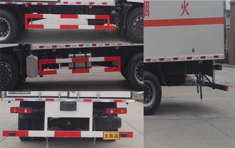 该车为危险品运输车.厢体顶部封闭,不可开启, 厢体选装平面和瓦楞板结构.该车随底盘选装驾驶室前面罩,前保险杆,前组合灯具,前雾灯;仅选用底盘4700,5000轴距,侧、后防护材料为Q235,连接方式均为焊接,后防护截面尺寸50?20mm,下边缘离地高490mm.该车主要用于运输独立容器包装的介质:粘合剂,涂料,料溶液,煤油,机油,苯,甲醇,乙醇,丙酮,甲苯,二甲苯,类项号: 3,厢体侧面板选装开百叶窗,选装不带侧门,侧门型式及位置; 选装不开侧门时整车宽度2510mm,选装开侧门时整车宽度2550mm.安装具有卫星定位功能的行驶记录仪,仅采用底盘子午线轮胎和带ABS的底盘; 该车消声器前置,安装限速装置及盘式制动,限速80km/h, ABS型号3631010-C2000;4460046440,生产企业东科克诺尔商用车制动系统(十堰)有限公司,威伯科汽车控制系统(中国)有限公司.转向轴已安装防爆胎装置,该车后轴仅采用空气悬架. |