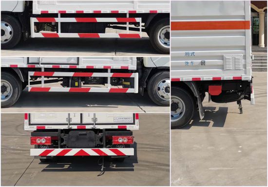 该车为危险品运输车辆,厢体顶部封闭,不可开启;仅采用底盘子午线轮胎,装配前轮盘式制动器,排气管前置,转向轮安装爆胎应急防护装置;安装带有卫星定位功能的行驶记录仪;装配限速装置限速80km/h;ABS系统型号:ABS-VI.E;生产企业:广州瑞立科密汽车电子股份有限公司.ABS系统型号:ABS-E;生产企业:威伯科汽车控制系统(中国)有限公司;ABS系统型号:YF8;生产企业:武汉元丰汽车电控系统有限公司;侧、后防护装置材质为Q235,侧、后防护采用螺栓连接,后防护截面尺寸(mm):120?0,离地高度为430mm;运输介质类项号:2.1,2.2;选装非易燃无毒气体的气瓶相应的标识;选装平板单开门,平板双开门,瓦楞板双开门;发动机Q23-115C60对应的油耗值为11.4L/100Km。 |