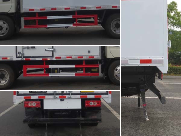 厢体顶部封闭,不可开启;随底盘选装驾驶室;厢体侧面选装开门型式及位置,选装不带侧开门,选装瓦楞板结构;运输介质类项号为:2.1,2.2;该车为危险品货物运输车;仅采用前轮盘式制动器,前置排气管,子午线轮胎,限速装置的底盘,限速80km/h;转向轮安装爆胎应急防护装置;发动机Q23-115C60对应油耗申报值为11.4L/100km;该车安装具有卫星定位功能的行驶记录仪;ABS系统型号:ABS-VI.E;生产企业:广州瑞立科密汽车电子股份有限公司.ABS系统型号:ABS-E;生产企业:威伯科汽车控制系统(中国)有限公司;ABS系统型号:YF8;生产企业:武汉元丰汽车电控系统有限公司;侧面防护及后下部防护装置材料材质:Q235,连接方式:焊接加螺栓连接;后下部防护装置断面尺寸(宽赘?:40?00(mm),离地高度:330mm. |