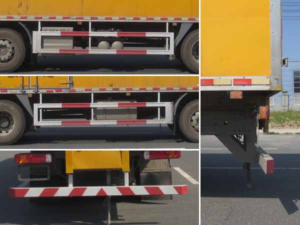 厢体顶部封闭,不可开启;随底盘选装驾驶室;厢体侧面选装开门型式和位置;额定载质量(kg)/整备质量(kg)/准乘人数(人)对应关系为:20070/11800/2,20005/11800/3,20520/11350/2,20455/11350/3;运输介质类项号为:3;该车为危险品货物运输车;仅采用前轮盘式制动器,前置排气管,子午线轮胎,限速装置的底盘,限速80km/h;后轴为空气悬架;转向轮安装爆胎应急防护装置;发动机/油耗申报值(L/100km)对应关系为:MC07.31-60/38.0,MC07.34-60/38.0,MC09.35-60/38.0,MC09.38-60/38.0,MC09.35B-60/38.0;该车安装具有卫星定位功能的行驶记录仪;ABS系统控制器生产企业/型号为威伯科(上海)管理有限公司/4460046300;选装EBS,EBS系统控制器生产企业/型号为威伯科(上海)管理有限公司/EBS3;侧面防护及后下部防护装置材料材质:Q235,连接方式:焊接;后下部防护装置断面尺寸(宽赘?:60?20(mm),离地高度:460mm. |