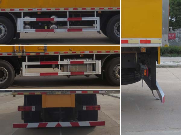 厢体顶部封闭,不可开启;随底盘选装驾驶室;厢体侧面选装开门型式和位置;运输介质类项号为:3;该车为危险品货物运输车;仅采用前轮盘式制动器,前置排气管,子午线轮胎,限速装置的底盘,限速80km/h;后轴为空气悬架;转向轮安装爆胎应急防护装置;发动机/油耗申报值(L/100km)对应关系为:YCK09400-60/37.6;该车安装具有卫星定位功能的行驶记录仪;ABS型号/企业:ABS-E 4S/4M/威伯科汽车控制系统(中国)有限公司;侧面防护及后下部防护装置材料材质:Q235,连接方式:焊接;后下部防护装置断面尺寸(宽赘?:60?20(mm),离地高度:430mm. |