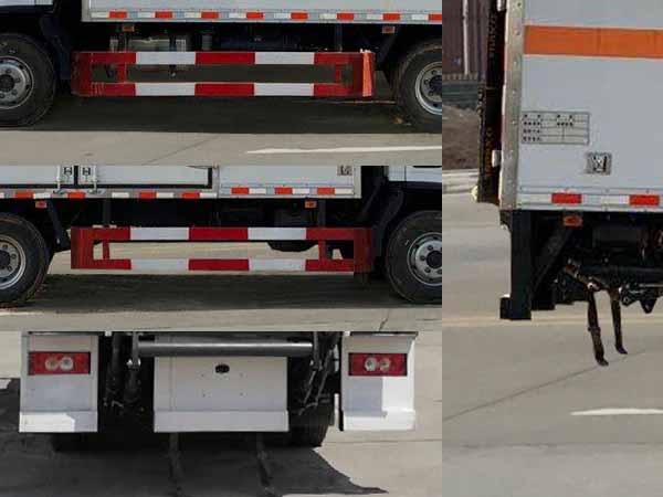 1、该车适用于运输危险品。厢体顶部封闭,不可开启。该车运输具有独立容器包装的易燃液体,运送危险品类项号为3。选装侧门型式及位置,选装不开侧门,厢体侧面板选装开百叶窗,选装瓦楞板结构。2、侧、后防护材料均为Q235,侧防护螺栓连接,后防护焊接,截面尺寸120?0mm,下边缘离地高410mm。3、仅采用3800mm的轴距。安装带有卫星定位功能的行驶记录。仅选用排气管前置、限速装置(限速80km/h)、前轮盘式制动及子午线轮胎的底盘;装有轮胎爆胎应急防护装置。ABS系统控制器型号/生产企业:ABS-E/威伯科汽车控制系统(中国)有限公司。发动机F3.8NS6B156的油耗值为:15.4L/100Km。液压升降尾板收起状态水平长度为290mm,尾板质量为420kg。选装后部无尾板。 |