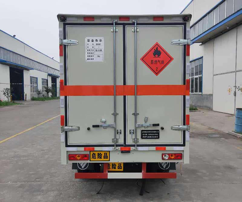厢体顶部封闭,不可开启.该车用于运输具有独立容器(瓶)包装的易燃气体[液化石油气(罐装)、压缩甲烷或甲烷含量高的压缩天然气,乙炔,乙烷,丁 烷,丁烯,丙烯,二甲醚,压缩氢]和非易燃无毒气体(二氧化碳、氧气、氮气、压缩氧(氮,空气,氦,氩,氖)),类项号分别为2.1和 2.2;选装不带侧门时对应尺寸:货箱1700整车宽度1790,对应高度2615,货箱1800整车宽度1890,对应高度2715,该车配备ABS型号:YF9,ABS系统控制方式是双参数控制,生产企业:武汉元丰汽车电控系统有限公司 .仅装子午胎,采用前轮盘式制动,装备辅助制动装置,安装限速装置,限制最高车速为80km/h,安装具有卫星定位功能的行驶记录仪,排气管前置。发动机与油耗值对应关系:DAM15KL油耗值8.0L/100km.该车为危险品运输车.选装箱体样式. |