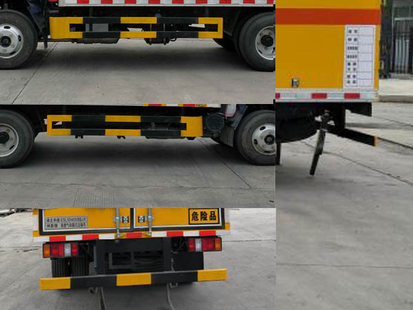 选装驾驶室,选装侧门,选装侧面不开门,选装百叶窗,选装不燃气体标识牌;该车用于危险品运输,厢体顶部封闭,不可开启;用于运输具有独立容器(瓶)包装的易燃气体,介质:液化石油气,压缩甲烷或甲烷含量高的压缩天然气,乙炔,乙烷,丁烷,丁烯,丙烯,二甲醚,压缩氢,类项号为2.1;运输具有独立容器(瓶)包装的非易燃无毒气体:二氧化碳,压缩氧(氮,空气,氦,氩,氖),类项号为2.2; 该车仅使用排气管前置,前轮为盘式制动器底盘,仅使用子午线轮胎;ABS系统型号:APG3550500A,ABS系统生产厂家:浙江亚太机电股份有限公司;该车安装具有卫星定位功能的行驶记录仪,该车装配有限速装置,限速80km/h;侧防护、后防护与车辆均采用螺栓连接,材料均为:Q235,后防护断面尺寸(mm):100?0, 离地高度430mm; 发动机JX4D30B6H和JX4D30A6H油耗值均为11.3L/100km.转向轮安装轮胎爆胎应急防护装置 |