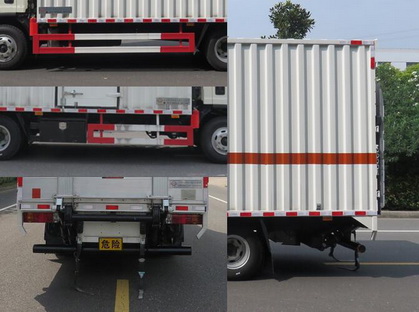 该车为危险货物运输车。该车车厢顶部封闭,不可开启; 尾板收起状态的水平长度为295mm;尾板总质量:500kg。车身侧面及后部粘贴橙色反光标识和易燃液体菱形标示,在车体后部设置安全标示;运输介质:用于运输具有独立容器(瓶)包装的涂料溶液,粘合剂,煤油,苯,甲醇,乙醇,丙酮,甲苯,二甲苯,运输介质的类别和项别号:3;防护装置材料为Q235,与车辆连接方式为螺栓连接;后防护装置断面尺寸(mm)为Φ110,离地高度400mm。该车安装具有卫星定位功能的行驶记录仪;安装限速装置,限速80km/h;排气管前置;安装子午线轮胎;前轴装配盘式制动器;转向轮安装轮胎爆胎应急防护装置。 ABS系统控制器型号/生产企业对应关系:VIE ABS-II/上海万捷汽车控制系统有限公司。该车仅选用CA4DD1-15E5的发动机,其对应的油耗申报值(L/100km)为17.9。该车选用7.50R16 14PR,8.25R16 14PR的轮胎。该车选装不带液压尾板结构。该车选装不带侧开门厢体。 |