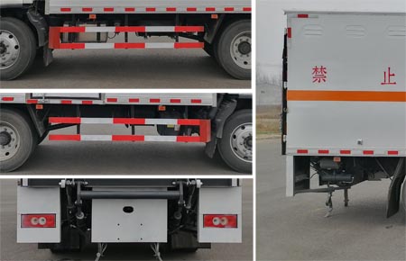 该车为危险品运输车.该车顶部封闭,不可开启.运输独立容器(瓶)包装的易燃气体气瓶:液化石油气,压缩天然气,压缩氢气,乙炔,丁烷,丙烷,丁烯,丙烯,甲乙醚,打火机或打火机加油器,类项号2.1;运输独立容器(瓶)包装的非易燃无毒气体:压缩空气,压缩氧,二氧化碳,压缩氮,压缩氦,压缩氩,压缩氖.类项号2.2.选挂2.1类易燃气体警示牌或2.2类非易燃无毒气体警示牌.整车长/前悬/轴距/后悬对应关系为(mm):7100/1130/3800/2170,7320/1130/3800/2390.后部安装液压尾板,液压尾板收起水平长度300mm,尾板重量为450kg,侧防护材料:Q235,连接方式:焊接连接,后防护由专用装置代替,后部专用装置离地高为480mm;选装后部不带尾板样式时侧、后防护装置材料:Q235,连接方式均为焊接,后防护截面高100mm,截面宽50mm,下边缘离地高480mm.选装侧开门型式及位置;选装侧开门时整车宽度为2480mm;选装不开侧门时整车宽度为2430mm.厢体选装开百叶窗.仅采用排气管前置,子午胎,限速装置,辅助制动装置和前盘制动器的底盘;限速80km/h.安装具有卫星定位功能的行驶记录仪;ABS系统控制器型号/生产企业:ABS-E/威伯科汽车控制系统(中国)有限公司,ABS-VI稥/广州瑞立科密汽车电子股份有限公司.发动机型号及油耗值(L/100km)对应关系为: F3.8NS6B156/20.8.转向轴已随底盘安装防爆胎装置. |