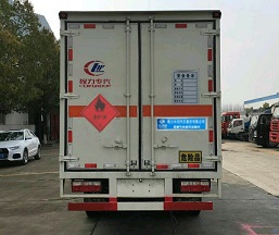 该车适用于运输危险品为危险货物运输车。选装右侧箱体不开门,选装不开侧门时对应的宽度为2400mm。车厢顶部不可开启。选装侧门型式及位置。安装限速装置,限速80km/h。安全装置为导静电带,用于防止静电。该车安装带有卫星定位功能的行驶记录仪,仅采用前盘制动器和安装ABS的底盘,排气管前置,仅采用子午线轮胎。该车运输具有独立容器包装的易燃气体:液化石油气,压缩天然气,乙炔,乙烷,丙烷,丁烷,异丁烷,丁烯,甲烷,丙烯,环丁烷,丙二烯,甲乙醚,打火机或打火机加油器(装有易燃气体),氢,运送危险品类项号为2.1。侧防护和后防护装置材料材质为Q235A碳钢,侧防护与箱体底部焊接连接,后防护装置与车架采用焊接连接。后防护截面尺寸(mm):100?0,离地高度为500mm。发动机CY4SK251,YC4S150-50,4DX23-140E5对应的油耗值分别为:23.6,24.0,24.8。ABS系统生产厂家及型号 :襄阳东风隆诚机械有限责任公司,ABS/ASR-24V-4S/4M.随底盘选装驾驶室. |