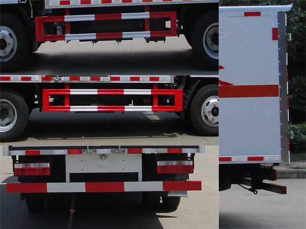 该车用于危险品运输,厢体顶部封闭,不可开启.厢体选装平面和瓦楞板结构,厢体侧面选装开门型式及位置或不带侧开门,选装百叶窗,选装液压升降尾板(收起状态水平长度为300mm)该车主要用于运输独立容器包装的易燃气体气瓶:运送危险货物的品名为液化石油气,压缩天然气,压缩氢气,甲烷,乙炔,丁烷,丙烷,打火机或打火机加油器,压缩煤气,压缩氧,溶解乙炔;运输具有独立容器包装的非易燃无毒气体:压缩空气 (二氧化碳、氧、氮、氦、氩、氖).运送危险品类项号:2.1、2.2.侧、后防护装置材料材质均为Q235,连接方式:左右侧面及后下部防护均采用焊接连接,后部防护装置断面尺寸(宽赘?50?00(mm),后部防护离地高度470mm.随底盘选装驾驶室,安装带有卫星定位功能的行驶记录仪,安装前置排气系统、前轮盘式制动器及辅助制动,安装限速装置,限速80km/h,仅采用子午线轮胎,ABS厂家及型号:襄阳东风隆诚机械有限责任公司/ABS/ASR-24V-4S/4M.采用发动机型号与油耗申报值(L/100km)一一对应: CY4BK551/12.4,YC4FA115-50/12.6,D28D11-5DA/12.5,YN33CRE1/12.4. |